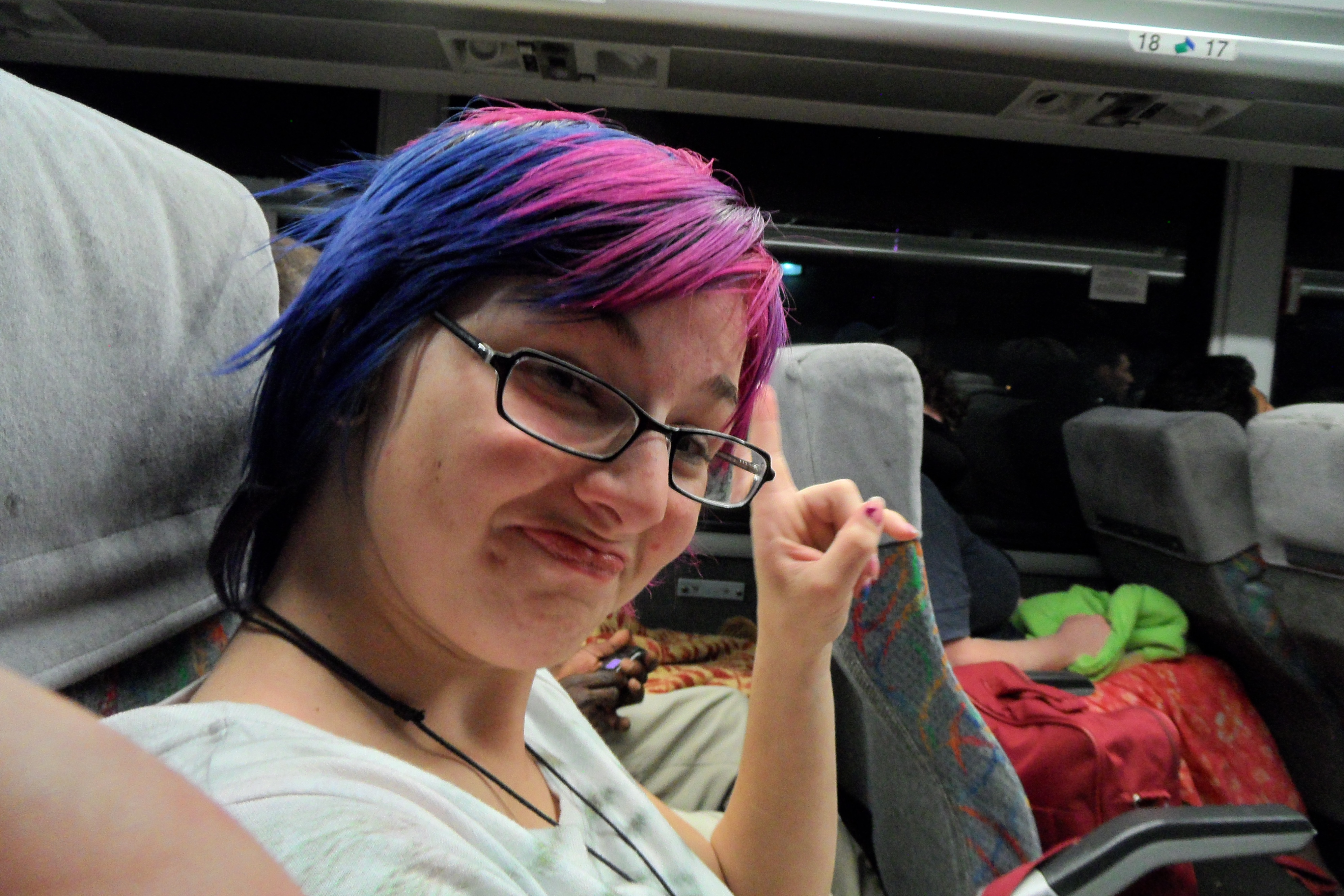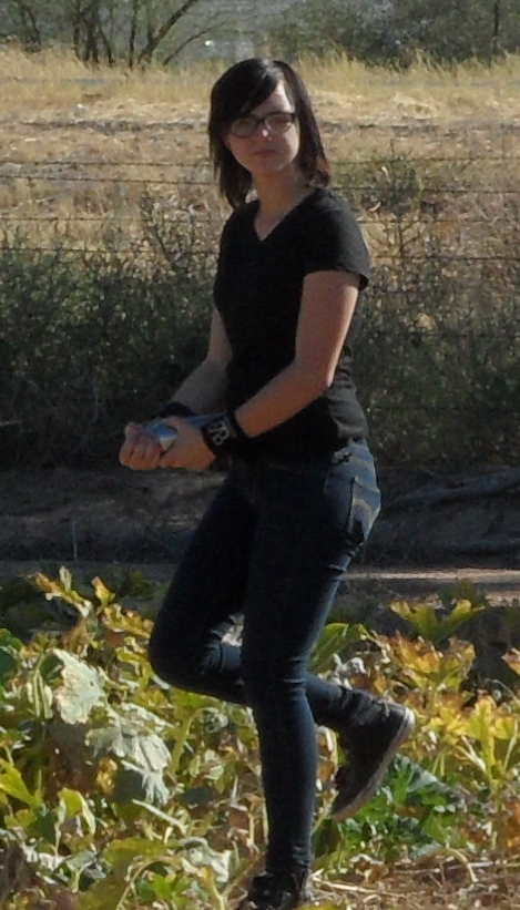 Hair color, obviously, subject to change. When last I saw her it was black, with brown roots. She had cut it herself. She has gauges in both ears. She may be carrying a full-size acoustic guitar with a neckstrap I crocheted for her.